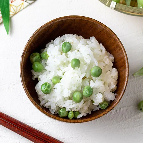 甘みのある青豆をふっくら炊き上げ、ほんのり塩味を効かせたやさしい味わい。春の定番ご飯として、さっぱりとお楽しみいただけます。