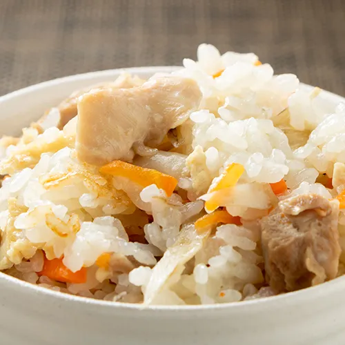 関西風の優しい味わいが広がる炊き込みご飯。特製のだしで炊き上げ、人参、ごぼう、椎茸、油揚げなどの具材の旨みを引き出しました。素朴ながらも奥深い味わいが特徴です。
