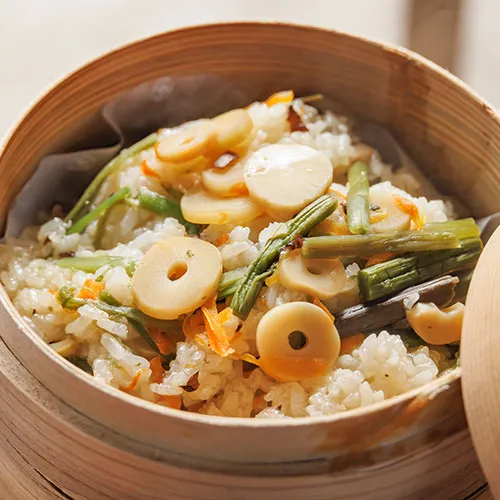 ぜんまい、わらび、ふきなどの山菜をたっぷり使用。特製和風だしの風味がご飯に染み込み、シャキシャキ食感と豊かな香りが楽しめる一品です。
